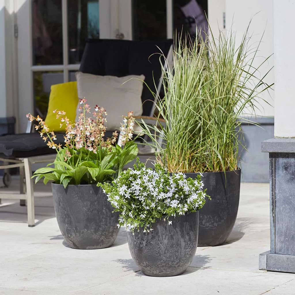 Healthy plants are easy to grow thanks to the unique water reservoir in the base that allows plants to draw up water in dry conditions and avoid roots sitting in waterlogged soil when wet. These planters therefore work best with the plant re-potted directly into them rather than left in their grow pots. If the intention is to leave the plant in its grow pot and sit it directly into the Artstone planter rather than re-potting the plant directly into the planter, please select a size large enough to cover the height of the grow pot.