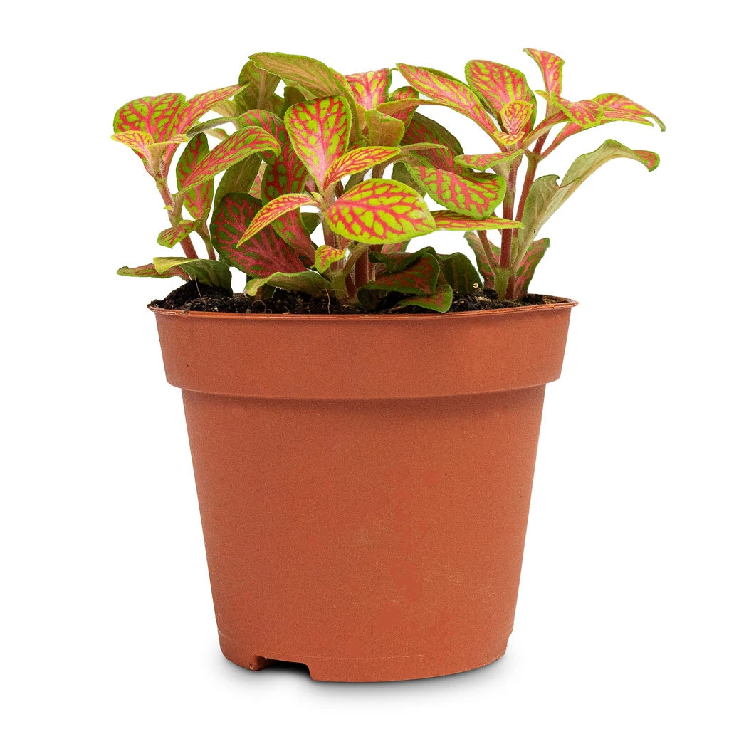 Prepare to be mesmerized by the stunning beauty of the Fittonia albivenis Mosaic Skeleton – Nerve Plant! This petite plant from Peru features absolutely exquisite foliage. Each olive green egg-shaped leaf is adorned with a mesmerising web of vibrant neon pink veins, creating an intricate and unique filigree-like pattern.