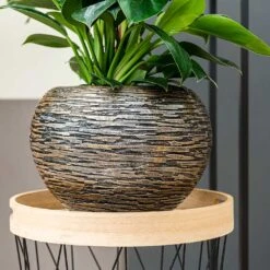 The Black Lava Balloon Relic Planter seamlessly combines ancient and modern craftsmanship to create a unique and sophisticated addition to any indoor or outdoor setting. Handcrafted and fired in traditional wood-fuelled ovens, these planters exhibit distinctive volcanic textures achieved through “Sgraffito” scratch-off techniques on various overlays, resulting in a bold black and brown hue with textured surfaces. With its large round ball shape, this planter adds elegance to any space, serving as a striking design element perfect for eye-catching floor-standing green displays.